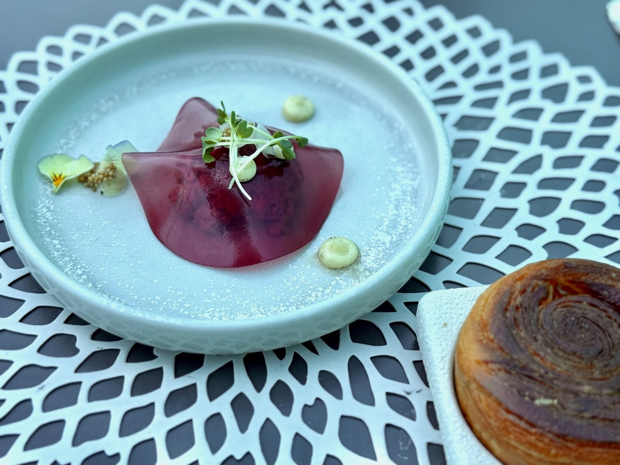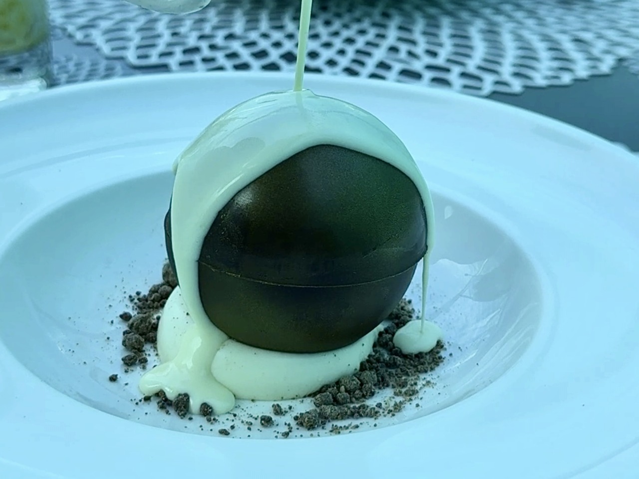 見た目がまずユニーク。チョコレートでできた球体の中には、いちごとホワイトチョコのムース、ベリーのコンポート、トリュフアイスが隠れていて、ソースをかけるととろ〜っと溶け出します。味も見た目も五感で楽しめるデザートでした♪