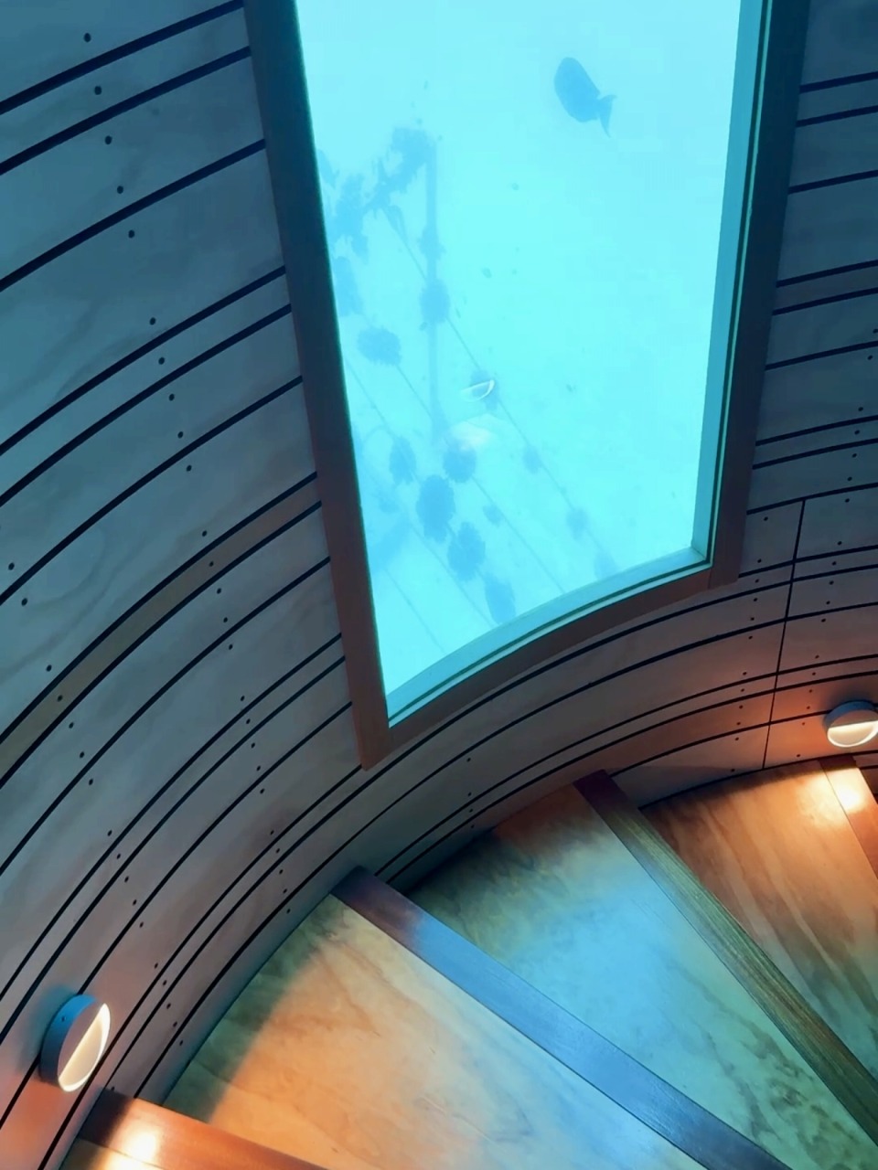 階段を降りていくと、徐々に光が差し込む青い空間が広がって、まるで水の中に吸い込まれていくような感覚に。もうすでにお魚の姿も🐟