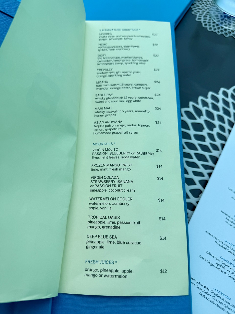 ドリンクは別料金だったので、わたしたちはノンアルコールのモクテルとフレッシュジュースをオーダー。