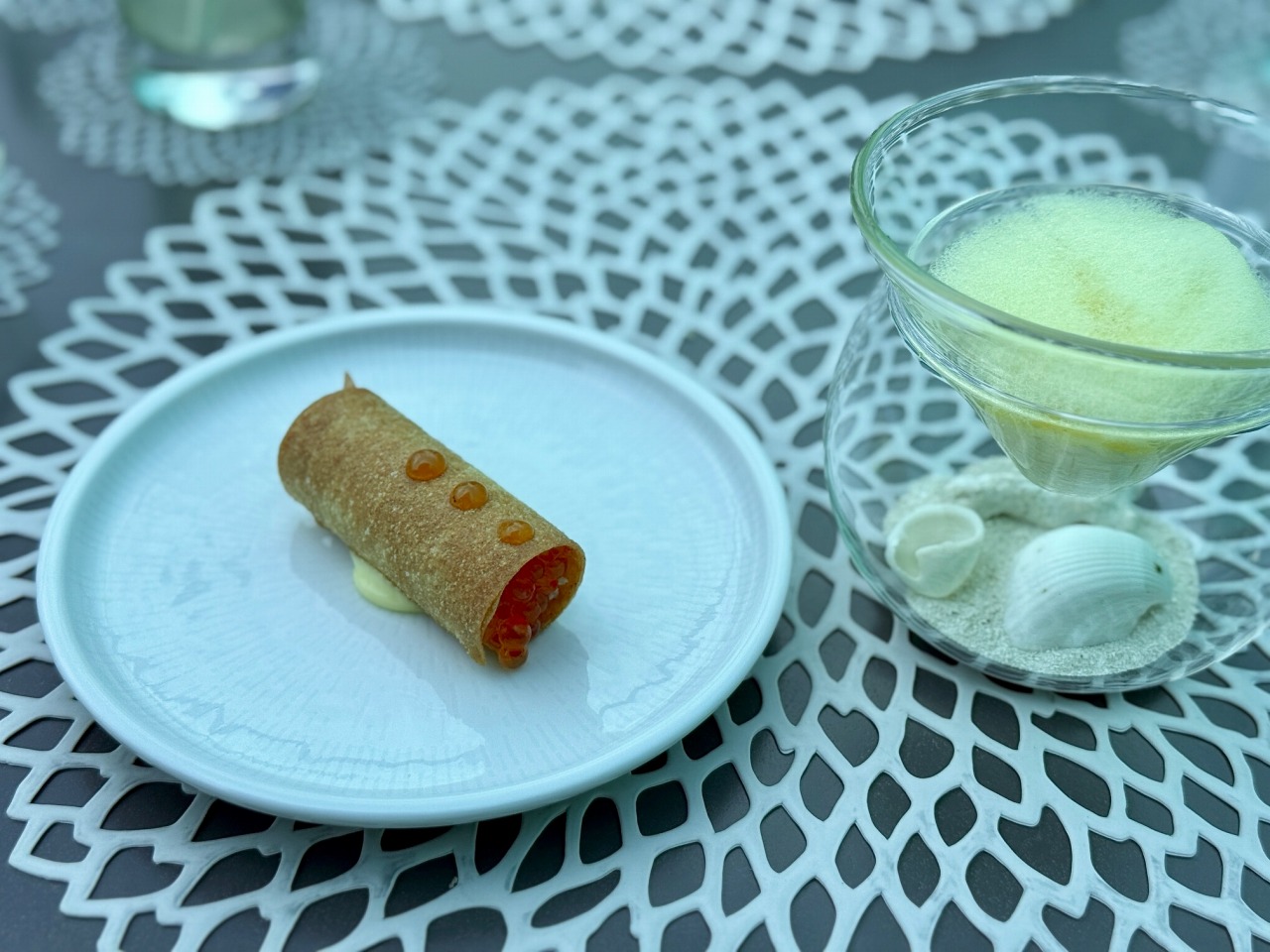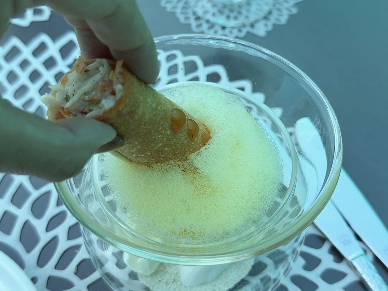 蟹の身をたっぷりと使ったシガー状のパリパリしたもの(?)に、セロリラブとリンゴのエスプーマをディップしていただきます。甲殻類好きにはたまらない贅沢な味わい。