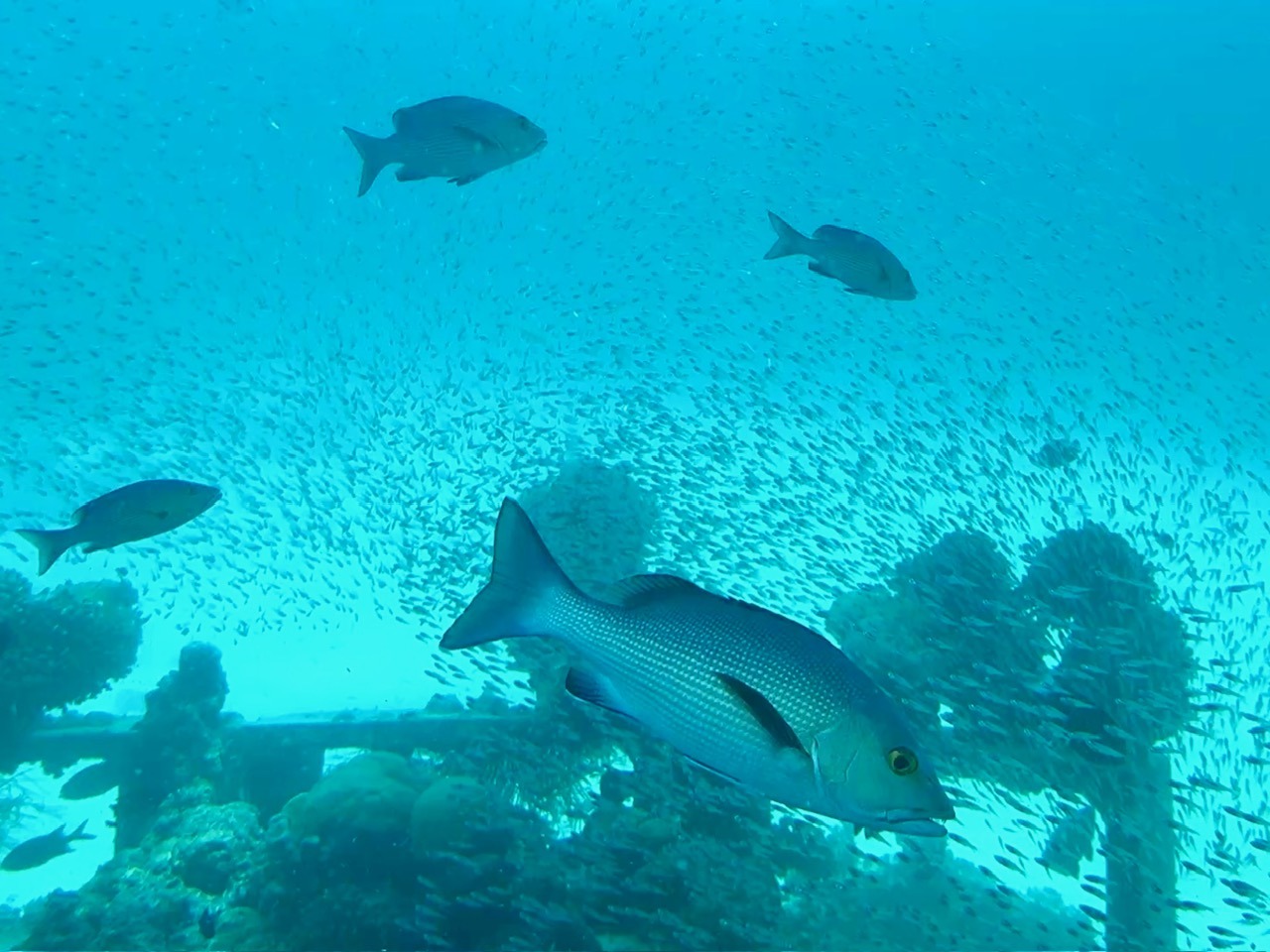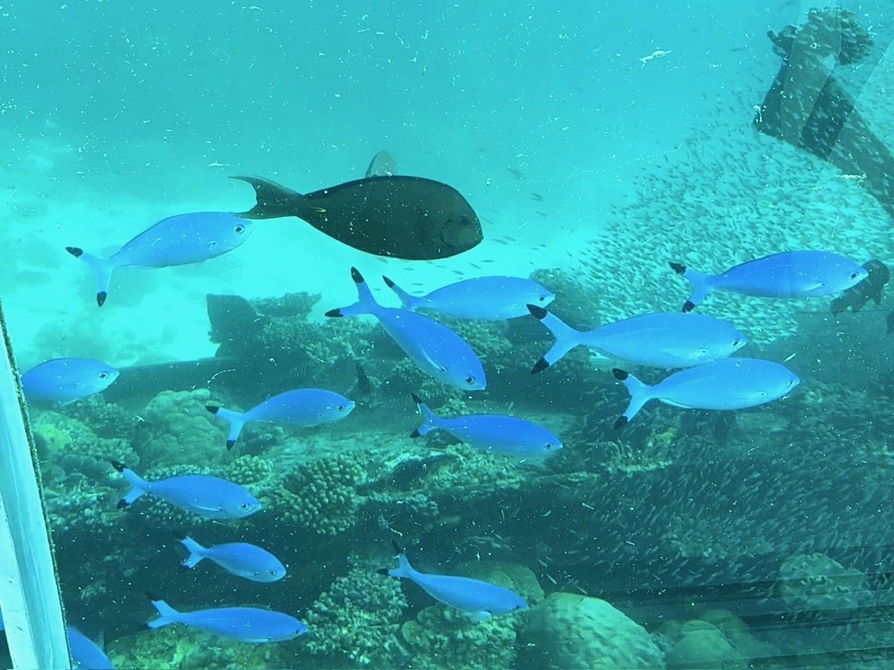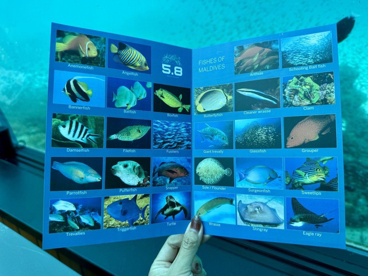席にはモルディブで見られる魚の種類を紹介したリーフレットが置かれていて「この魚はこれかな?」なんて会話をしながら、目の前を通る魚と照らし合わせて観察するのも楽しいひとときでした。