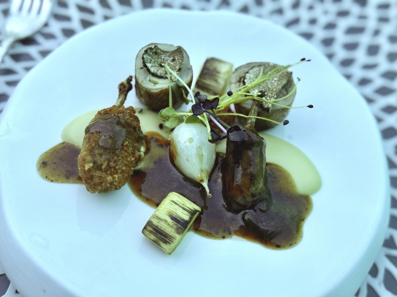中に詰め物をしたウズラに、アーティチョークのピュレやコンフィポロネギなどを添えた一皿。サクサクっとした食感がおいしい♪お野菜もたっぷりと添えられているのがうれしいです。