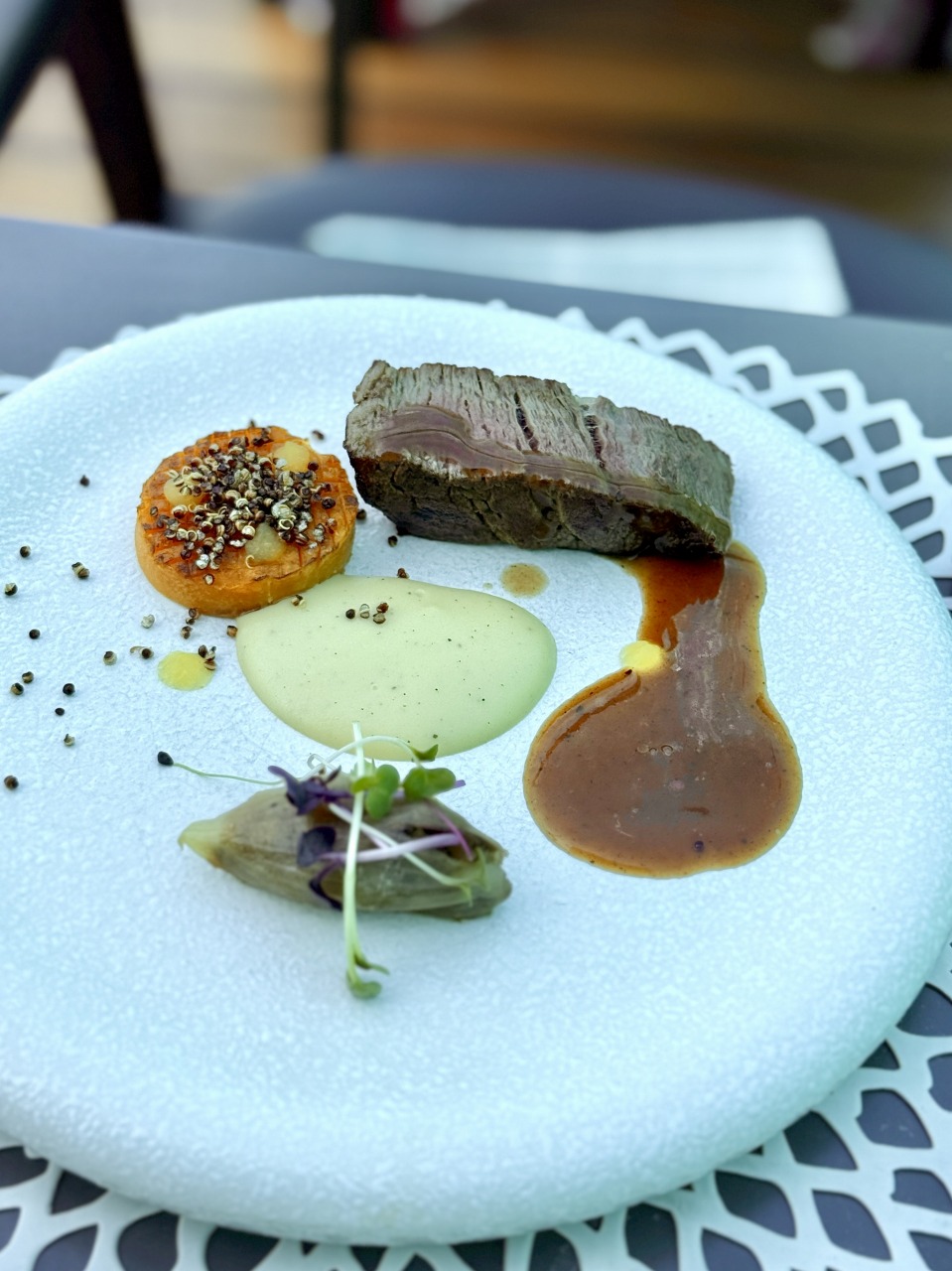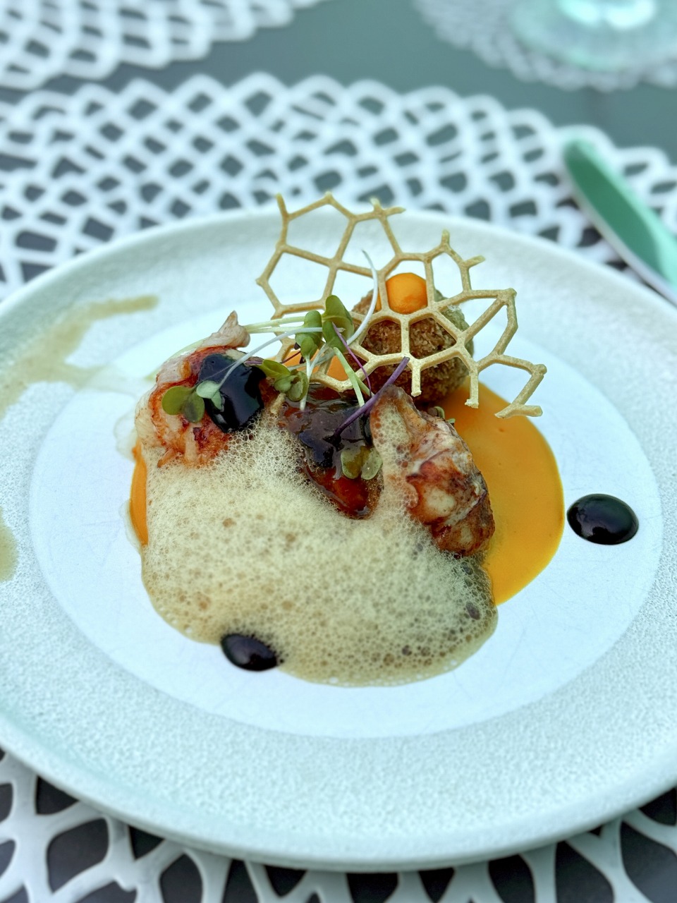 ロブスターのグリルと、ロブスターコロッケが主役の贅沢な一皿。キャロットピュレやイカ墨アイオリが添えられ、ひと口ごとに違う表情を楽しめました。とにかくロブスターがぷりぷりで絶品!