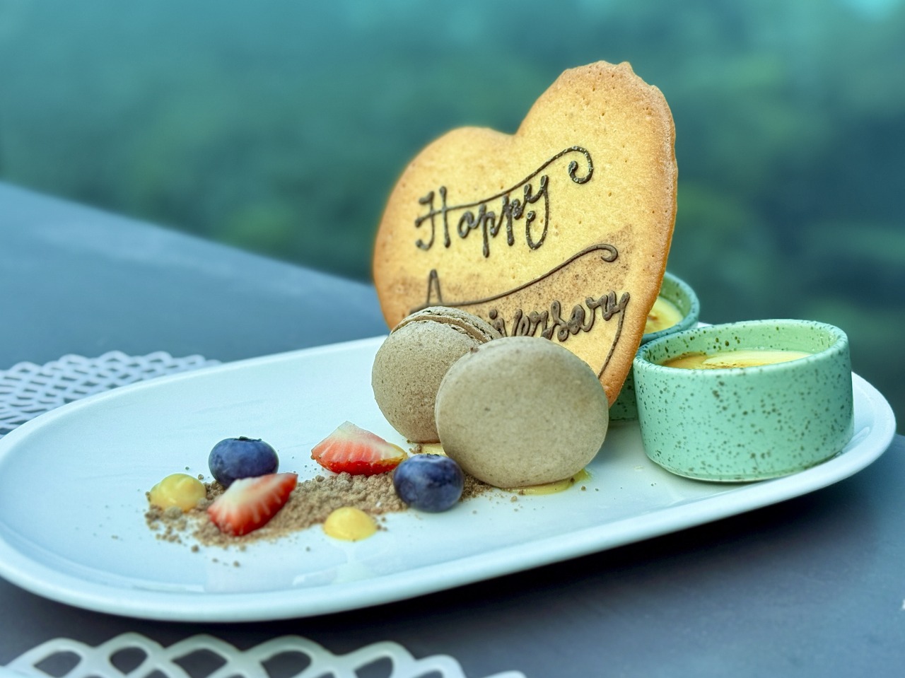 プレートには「Happy Anniversary」と描かれたクッキーが添えられ、周囲にはマカロンやプリン、カットされたフルーツが美しく盛りつけられています。