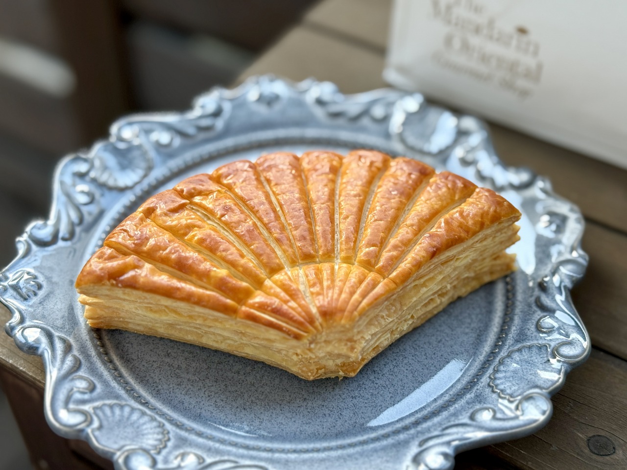 扇形=「末広がり」の縁起のよいフォルムで、マンダリンオリエンタルのロゴをモチーフにしたガレットデロワ。サイズ感は2~3人でちょうどいいくらい。